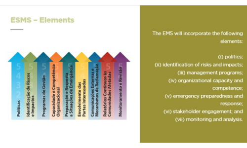 - Aprimoramento dos procedimentos de identificação de riscos e impactos, com inclusão sistemática dos aspectos sociais e uso do engajamento de partes interessadas como fonte de informação.